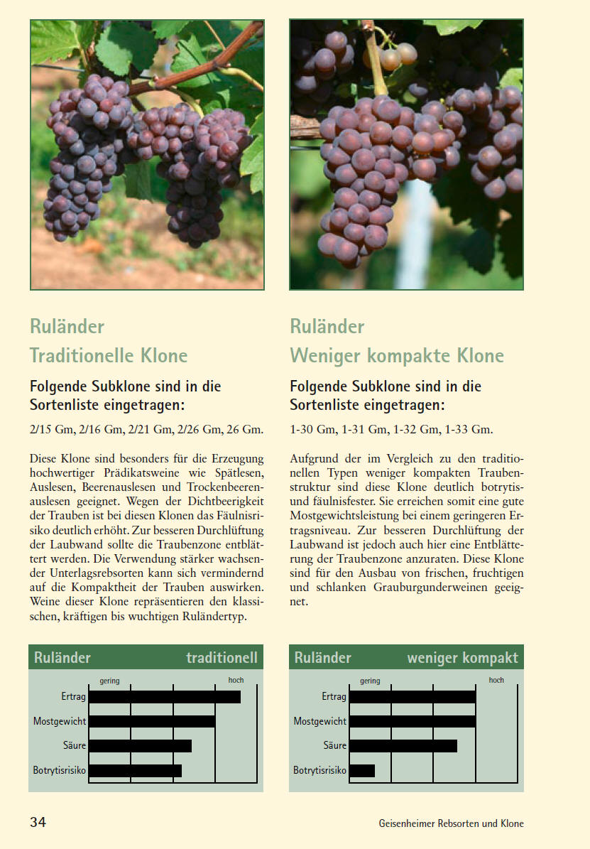 Weniger kompakter Klon Ertrag: mittel – hoch Aufgelockerte Traubenstruktur daher deutlich geringere Anfälligkeit gegen Fäulnis. Die Lockerbeerigkeit ist nicht vergleichbar mit den lockerbeerigen Spätburgunder-Klonen. |