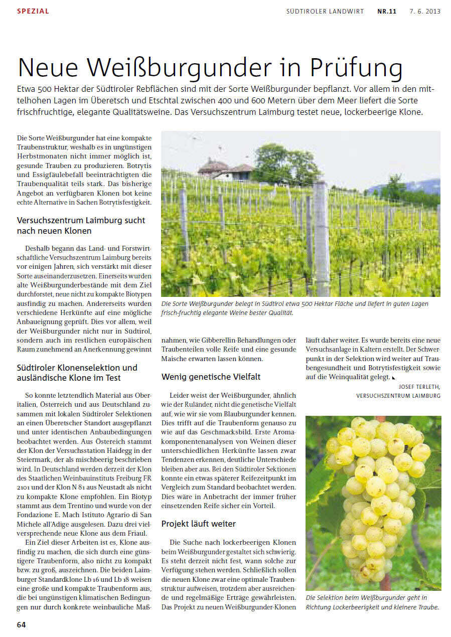 Für Weißburgunder typischen – kompakten Trauben. Die Erträge sind stabil, Zucker- und Säurewerte unterscheiden sich nur geringfügig von denen der anderen Klone. Weine von hoher Typizität. |